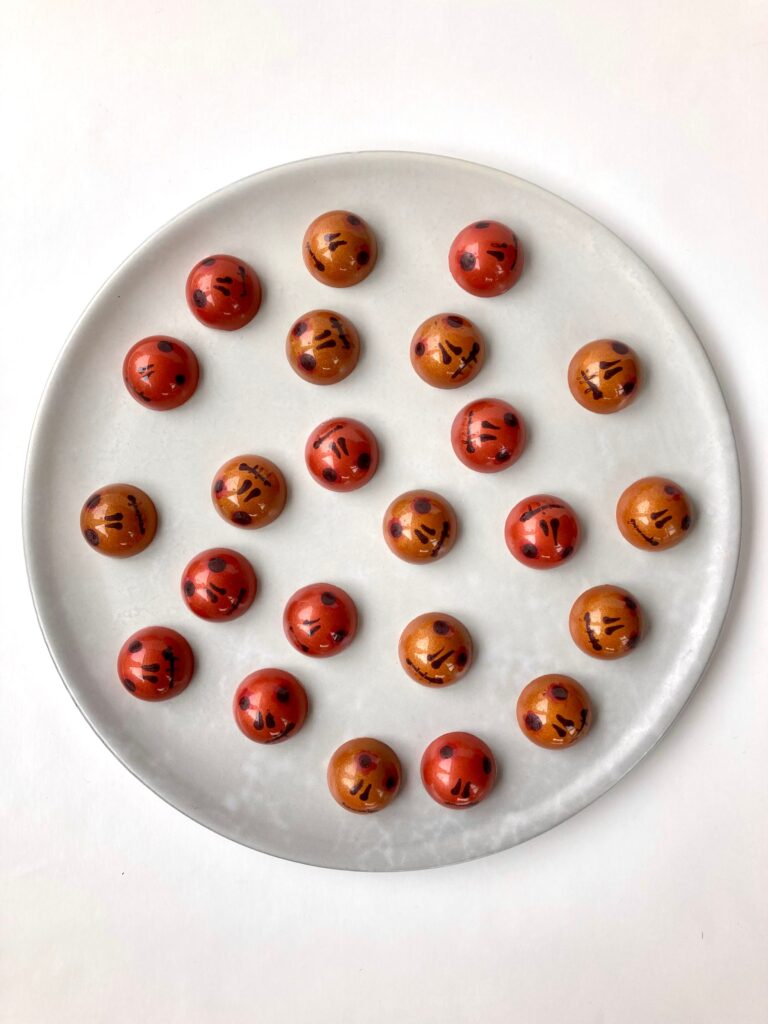 Chocolates tend to best marry with these butters, as the cocoa butters are fat soluble, meaning they offer the best possible coverage on high fat products. Simply spray, flick or roll your finger (with your coloured butter of choice) across your chocolate mould. Once set, pour tempered chocolate into your mould as you usually would and once set, the colours will transfer onto your chocolates!